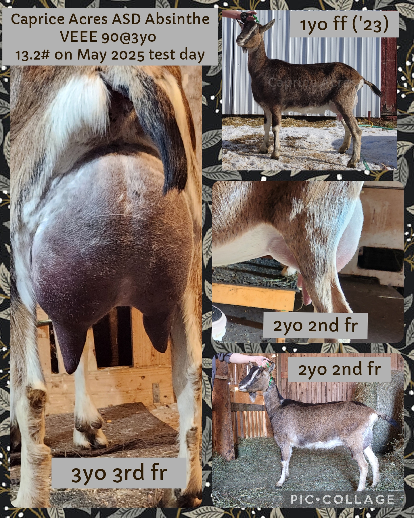 2025 – Triplet doelings sired by QMF Carrier of the Stone VG89. 1 was lost as a Jr with an intestinal intussuseption. Caprice Acres Mimosa was sold to a friend where she has been shown successfully including winning JCH. The final daughter, Caprice Acres COS Poloma is available for sale.