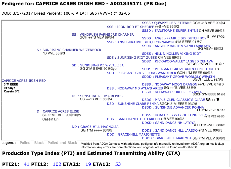 2021 – Well, Red may finally be the doe I wanted her to be. She had twins by Legacy, with a doe to retain. First tests are well over 11lbs. We are happy to be working with a nutritionist as herdwide numbers are more appropriate for their genetics and backgrounds now, and the entire herd looks amazing – Red included. She may just stick around a little longer with her daughter. Her CDCB numbers are kinda funky because of the move, I hope I combined the two “lactations” (one test day was done at QMF, the rest at the new farm) correctly above. Usually ADGA does this but their website still can’t do anything with this data so will change to the ‘official’ ADGA recognized lactation when they get around to that…