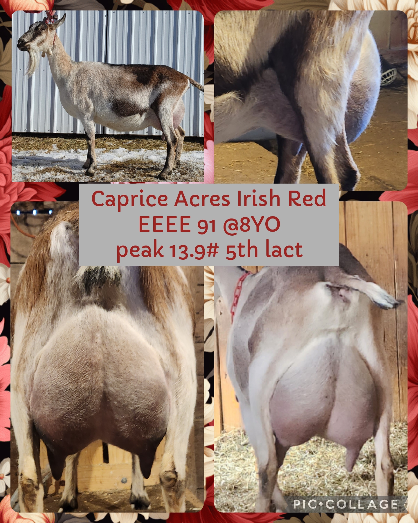 2023 – TRIPLETS sired by EX90 Mathias *ELITE*, and she freshened beautifully. Retained daughter, Lucretia. An exciting lactation getting close to 14lbs milk was hindered mid-lactation by a bout of severe inappetence/no milk during an odd illness. She was treated for ulcers and eventually recovered, but never did come back to previous production. She still managed to appraise EX90 with an E in udder again by appraisal so I’m pleased with that. As I write this in mid September, we’re also dealing with poor hay quality but she is still producing admirably. Another update – in late October 2023 she also presented with Listeriosis symptoms. While I think we are going to be able to save her as of this writing she has done her time in the ‘sick pen’ and is now in the general population again – it shut her lactation right down obviously. She still has facial paralysis but she seems able to feed her self and drink well enough to maintain. Of course she is only a few short weeks past breeding, so time will tell if she confirms as pregnant. This poor goat will never have a ‘good year’. She started out so promising this spring and was absolutely cranking milk. This year she has dealt with the weird illness (treated as ulcer), access to poor hay quality mid-lactation (first cut grass hay rather like straw), and now listeriosis. Thankful she had time to recover from the weird ulcer-like illness enough to appraise as well as she did. Hoping her daughter retained 2023 (Lucretia) has better luck as a brood doe.